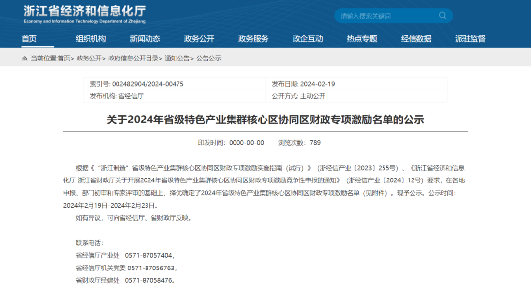 根据《“浙江制造”省级特色产业集群核心区协同区财政专项激励实施指南(试行)》(浙经信产业〔2023〕255号)、《浙江省经济和信息化厅 浙江省财政厅关于开展2024年省级特色产业集群核心区协同区财政专项激励竞争性申报的通知》(浙经信产业〔2024〕12号)要求,在各地申报、部门初审和专家评审的基础上,择优确定了2024年省级特色产业集群核心区协同区财政专项激励名单(见附件)。现予公示。公示时间:2024年2月19日-2024年2月23日。