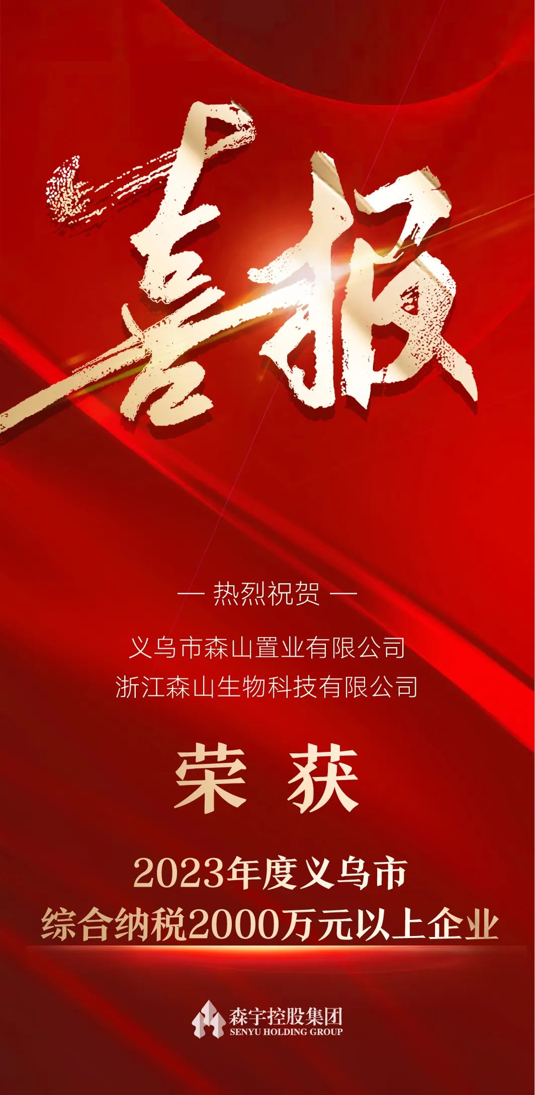 2月20日,义乌市总结表彰暨“打造典范、再造辉煌”动员大会召开。会议表彰了义乌市纳税先进企业,森宇集团旗下“义乌市森山置业有限公司”、“浙江森山生物科技有限公司”2家企业获“2023年度义乌市综合纳税2000万元以上企业”荣誉称号。这既是森宇集团综合实力的体现,也是对企业为义乌市经济建设发展做出贡献的肯定。