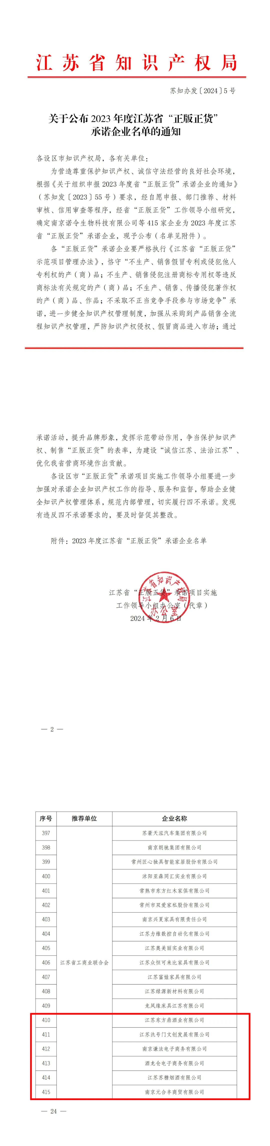 近日,江苏省知识产权局公布2023年度江苏省“正版正货”承诺企业名单,由江苏省酒类行业协会推荐的6家会员企业成功入选!