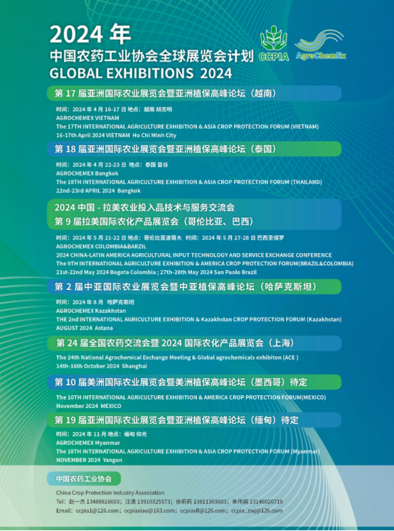 为进一步促进中国植保产品在南美区域拓展市场,提升企业国际化品牌价值,引领更多优秀农化企业和优质农化产品助力全球植保市场高质量发展,中国农药工业协会国际贸易委员定于2024年5月27-28日在巴西圣保罗举办“2024中国-拉美农业投入品技术与服务交流会暨第九届拉美国际农化产品展览会(巴西)”。