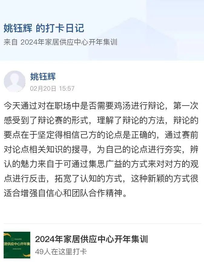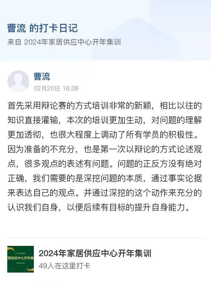 本次辩论作为家居供应中心年中辩论赛的前篇,不仅仅起到了预热的作用,更开启了学员们的辩论思维,打破禁锢思维的枷锁,提高应变能力与语言表达能力,再一次培养逻辑思维能力,使学员们切身感受到辩论赛的魅力。