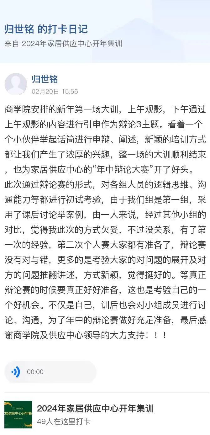 在课后作业环节,学员们均积极、按时高效提交,通过心得感悟的分享,体现出辩论思维对于个人的启发与碰撞。