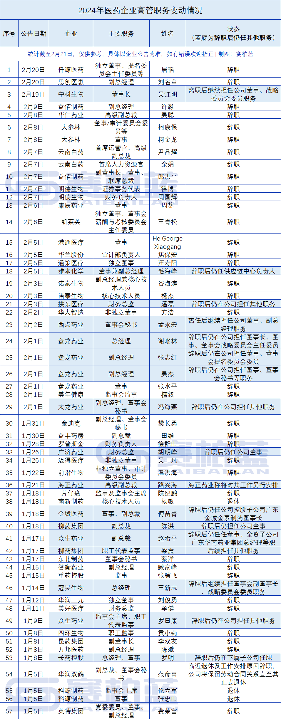 据赛柏蓝不完全统计,截至2月21日,今年已有至少57位医药企业高管离职,涉及片仔癀、华润三九、华润双鹤等46家企业(文末附完整名单)。