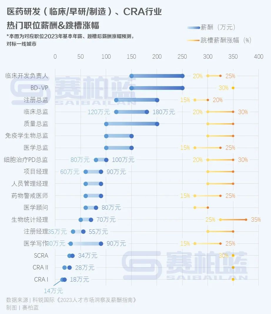另外,临床监查员(CRA)也保持着30%的跳槽涨薪幅度。据悉,临床监查领域人才缺口依旧较大,市场对于具有1~3年经验的临床监查员保持着较高需求,而3年经验以上的SCRA则面临需求饱和。