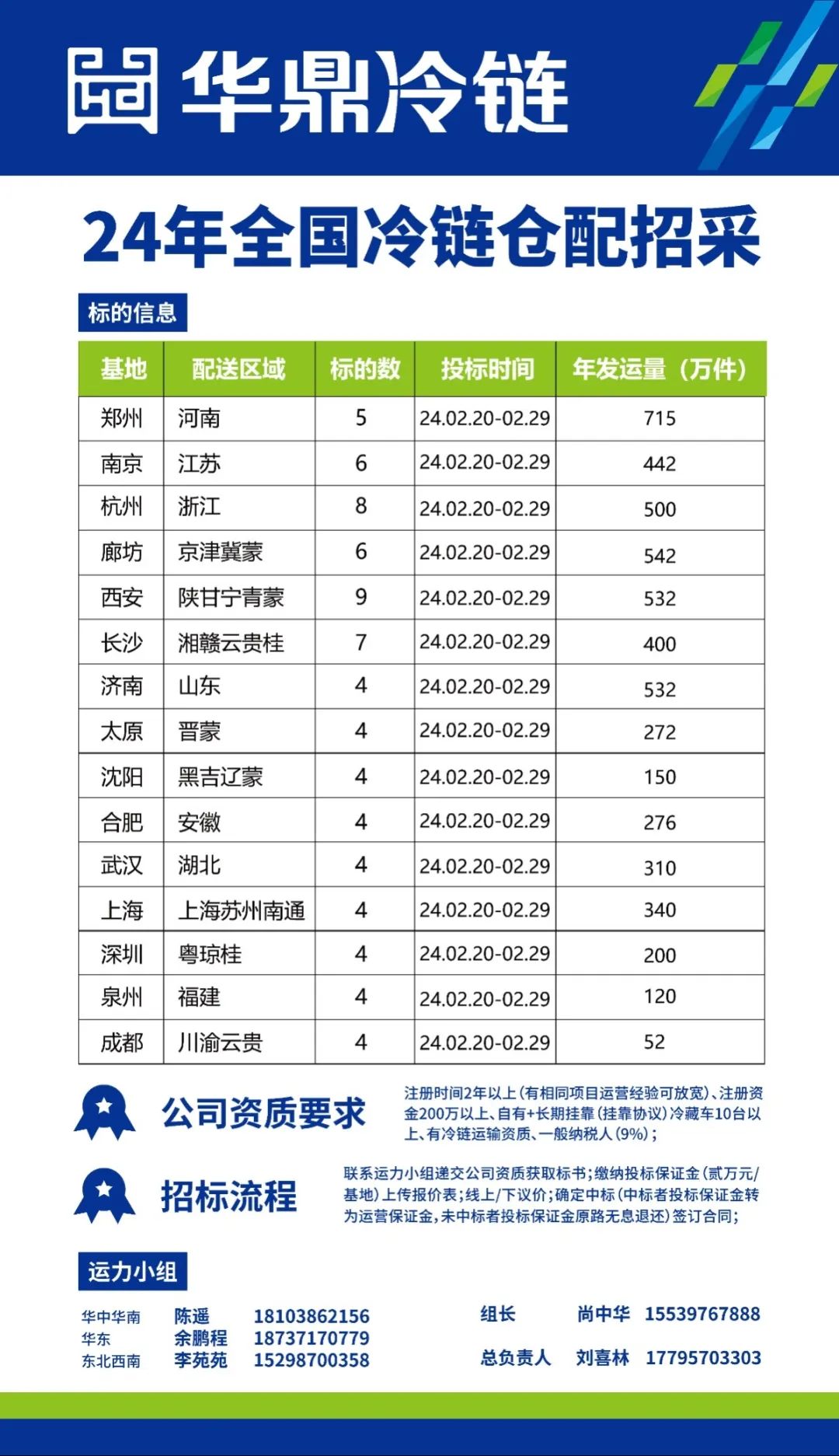 根据《中华人民共和国招标投标法》以及有关法律法规,遵循公开、公平、公正和诚实信用的原则,河南华鼎冷链仓配科技有限公司就2024年全国15个基地仓运输项目进行国内公开招标,欢迎有资质的企业参加投标。