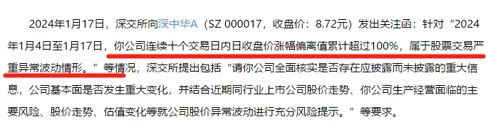 深中华7板当天收到异动监管,公告提示的是10个交易日涨幅超过100%,属于严重异常波动情形。之后不断收到监管函,并进入重点管控列表。