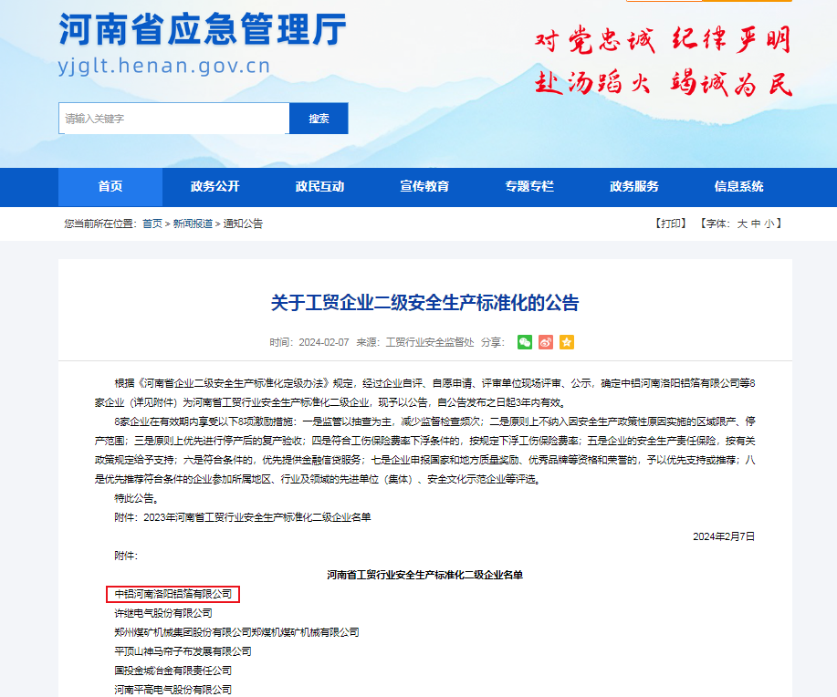 2月7日,河南省应急管理厅发布公告,对2023年河南省工贸行业安全生产标准化二级企业进行公示。根据《河南省企业二级安全生产标准化定级办法》规定,经过企业自评、自愿申请、评审单位现场评审、公示,确定中铝河南洛阳铝箔有限公司为河南省工贸行业安全生产标准化二级企业,并予以公告,自公告发布之日起3年内有效。