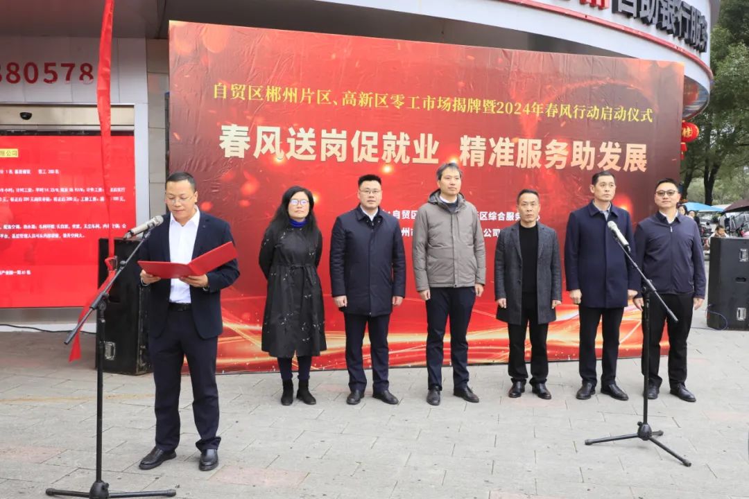2月21日上午,自贸区郴州片区、高新区零工市场揭牌仪式暨2024年春风行动启动仪式举行,自贸区郴州片区、高新区党工委委员、副主任李富春,市人力资源和社会保障局党组副书记、副局长李伟清,郴州市人才集团有限公司党委副书记、总经理欧辅国出席活动。
