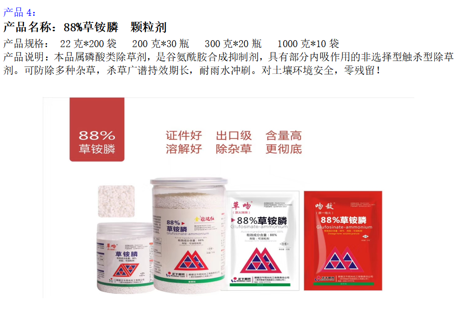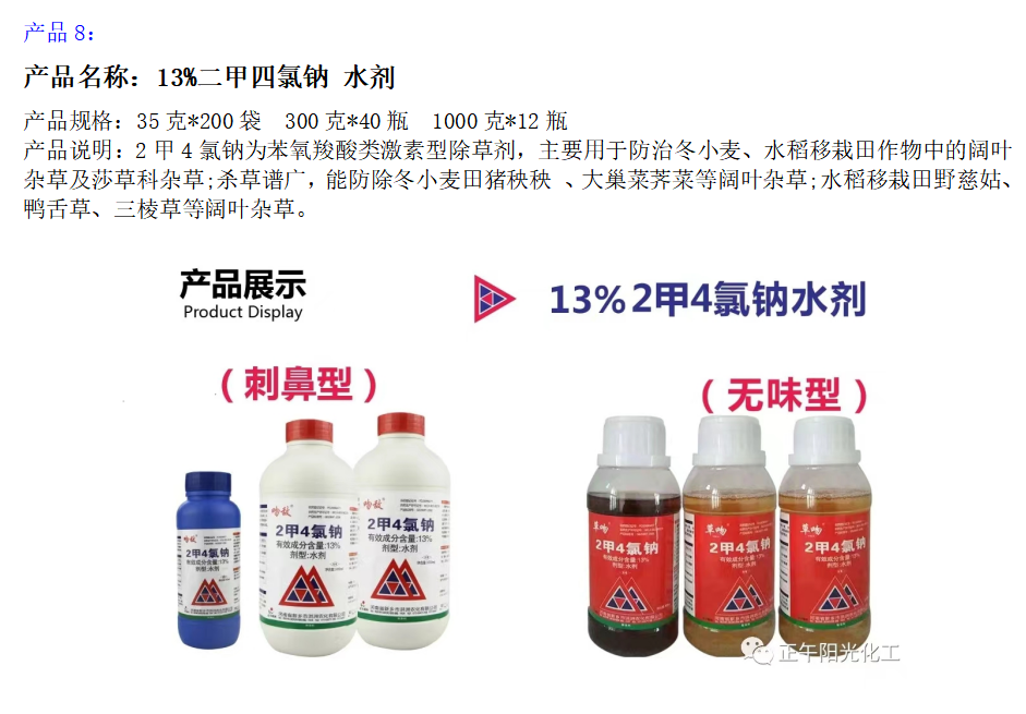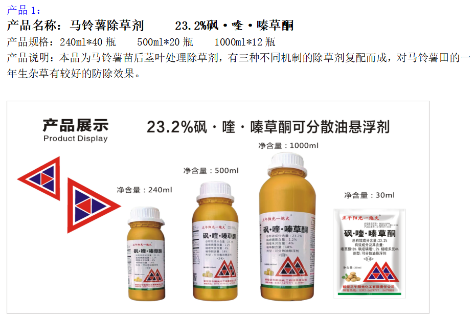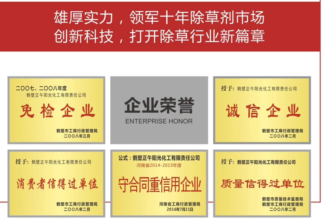 鹤壁正午阳光化工有限责任公司成立于2004年06月。是一家研发、生产及销售除草剂二十年企业,当地免检企业,公司产品有:马铃薯苗后除草剂和草甘膦、草铵膦、滴酸草甘膦、敌草快、二甲四氯钠、乙草胺、二甲戊灵等,产品覆盖:广东、广西、海南、云南、四川、贵州、湖南、湖北、山东、河北、甘肃、新疆等地深得用户一直认可!公司承诺:含量不够 双倍赔款!