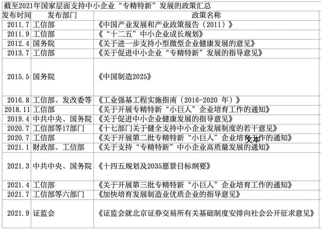2013年,中小企业「专精特新」首次部署 2018年末,工信部开展了首批「专精特新」小巨人企业培育工作,励志在三年内培育出600家「专精特新」小巨人 2021年7月,中央政治局会议首提发展「专精特新」中小企业 2021年9月,北京交易所宣布设立,其核心是为「专精特新」中小企业服务