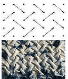 要使缝褶的大小很好地体现造型特色、组合方式等,应该在缝制前仔细研究、试验缝褶针法的构成方式,使纹理与造型之间产生强烈的视觉冲击,以达到理想的造型效果。通过试验发现:浅而疏的褶皱,具有优雅而流畅的肌理效果。采用平行的几何形构成方式,如三角形、四边形、多边形等;将缝制的点与点之间的间隔设置成3cm×3cm 以上,间隔根据设计需要而调整;在面料尺寸方面,准备成品尺寸1.5倍的面料,并留出足够的面料边缘缝份。深而密的褶皱,可以产生精巧细致的肌理,采用基本点的重复转折或重复交叉(图4),点与点之间的间隔可以设置在1cm×1cm 至2cm×2cm 间,在面料尺寸方面准备成品尺寸3倍的面料。