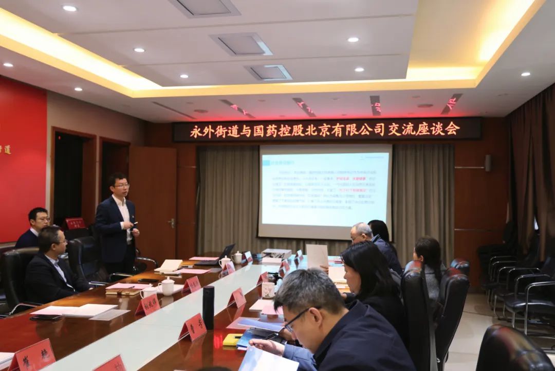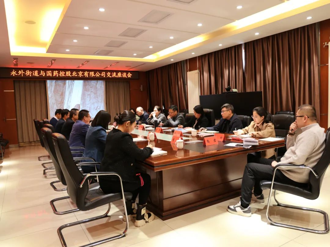 为推动经济社会高质量发展,全面落实优化营商环境,进一步密切政企合作关系,2月21日,国药控股北京有限公司到永外街道交流座谈。永外街道工委书记张黎,工委副书记、办事处主任曹芳,工委委员、纪工委书记、派出监察组组长任继霞,办事处副主任杜劼参加座谈。