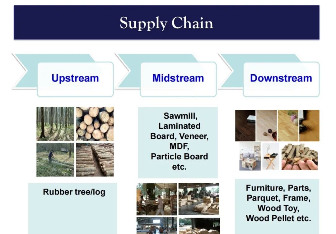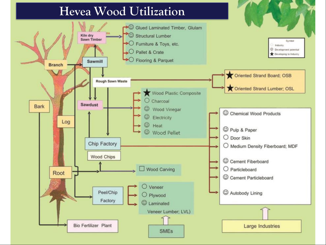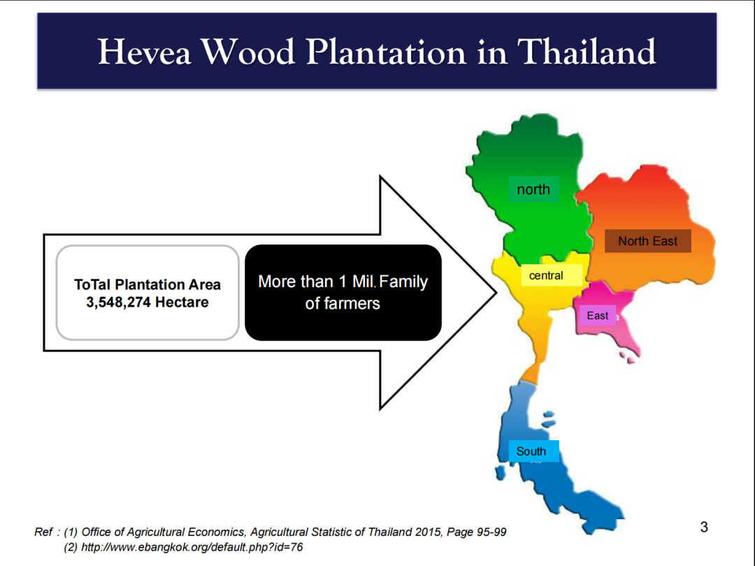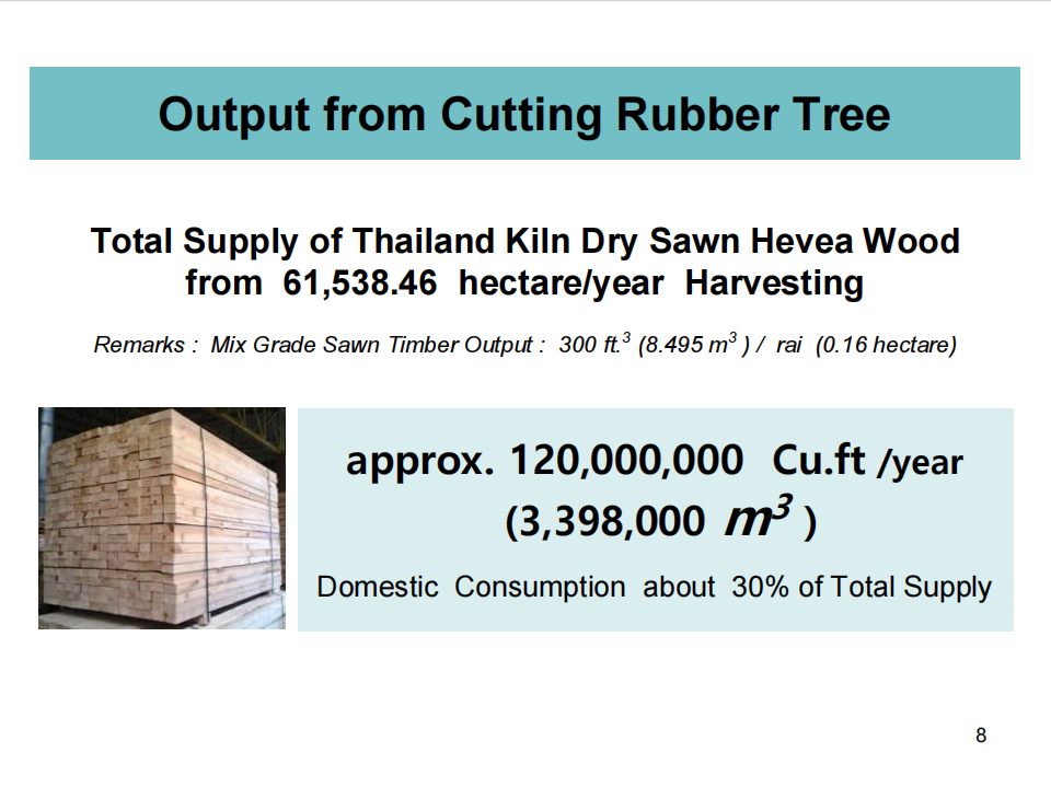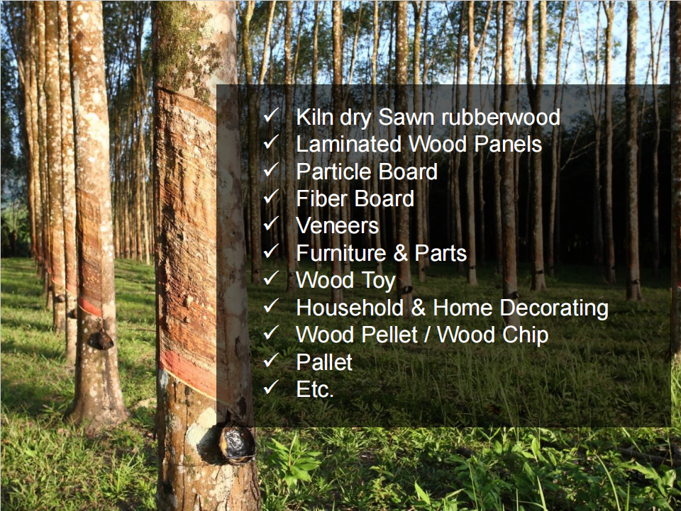 泰国拥有超过1百万家橡胶木种植园,种植面积约354.8万公顷。泰国的橡胶木利用是全方面的,中端产品涵盖胶合板、结构木材、家具&玩具、托盘、地板、木塑复合材料、化学木制品、纸浆&造纸、纤维板、刨花板等领域。每年橡胶木产量(φ>5英寸)1200万吨,约339.8万立方米,国内消耗占总量的30%。每年根茎、树根及废料等总产量约1160万吨,其中一半应用于纤维板、刨花板等产品生产,一半用于生物质发电厂。