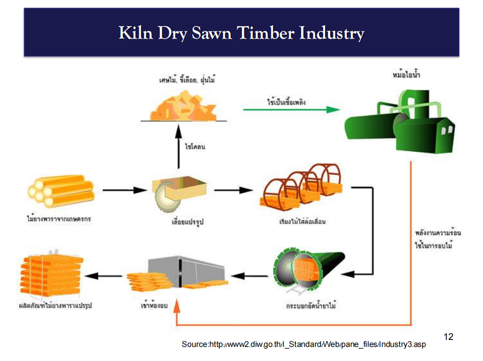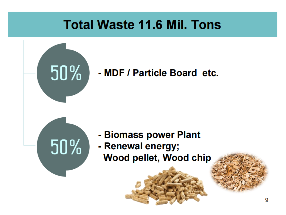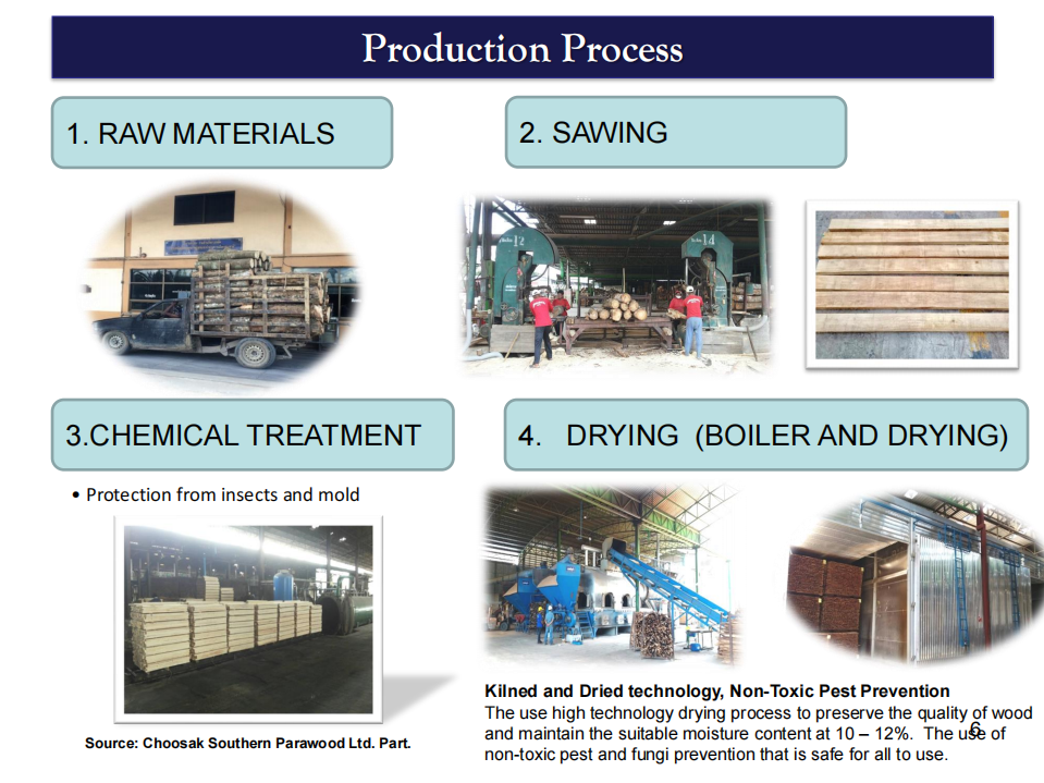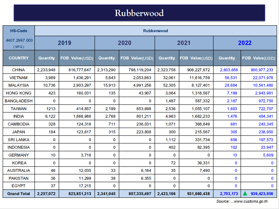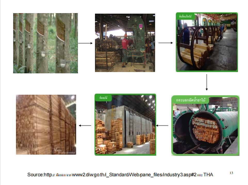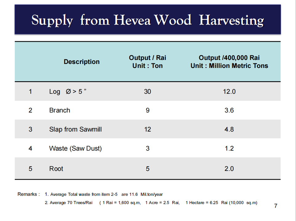 泰国拥有超过1百万家橡胶木种植园,种植面积约354.8万公顷。泰国的橡胶木利用是全方面的,中端产品涵盖胶合板、结构木材、家具&玩具、托盘、地板、木塑复合材料、化学木制品、纸浆&造纸、纤维板、刨花板等领域。每年橡胶木产量(φ>5英寸)1200万吨,约339.8万立方米,国内消耗占总量的30%。每年根茎、树根及废料等总产量约1160万吨,其中一半应用于纤维板、刨花板等产品生产,一半用于生物质发电厂。