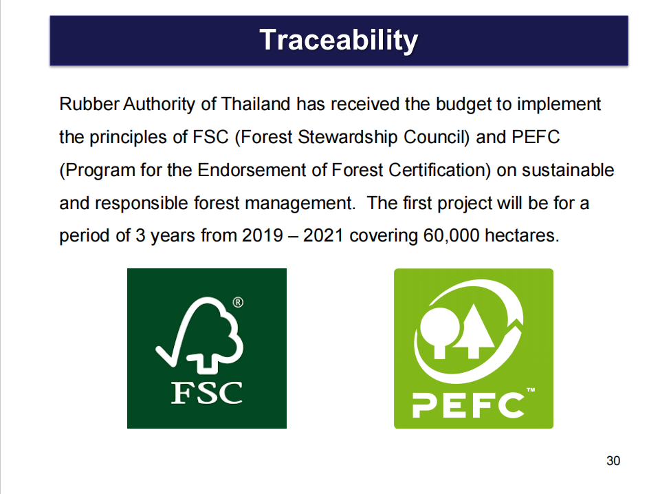 泰国橡胶管理局已经获得预算,用于实施森林管理委员会认证(FSC)和森林认证认可计划(PEFC)确定的“可持续和负责任的森林管理”原则。第一个项目为期3年,从2019年到2021年,占地60000公顷。