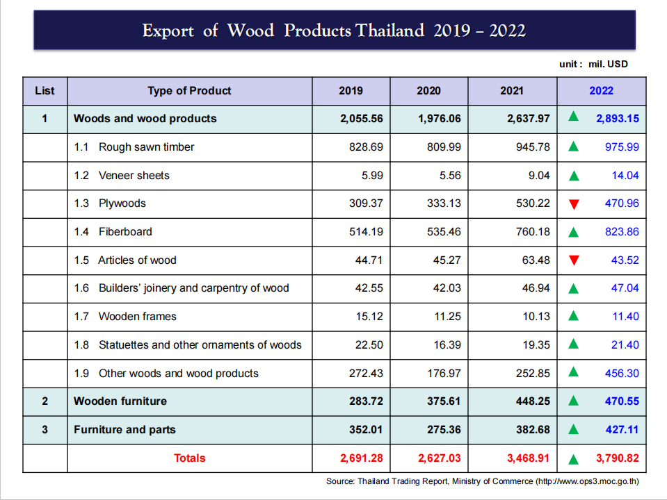 截至2023年初,泰国出口木材与木制品总量为37.9亿美元,破历史新高。粗锯材、单层板等粗加工木制品出口量为28.9亿美元,木质家具出口4.7亿美元,家具零部件出口4.27亿美元,从贸易额看,中国一直都是主要的出口市场。