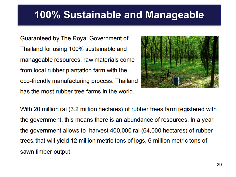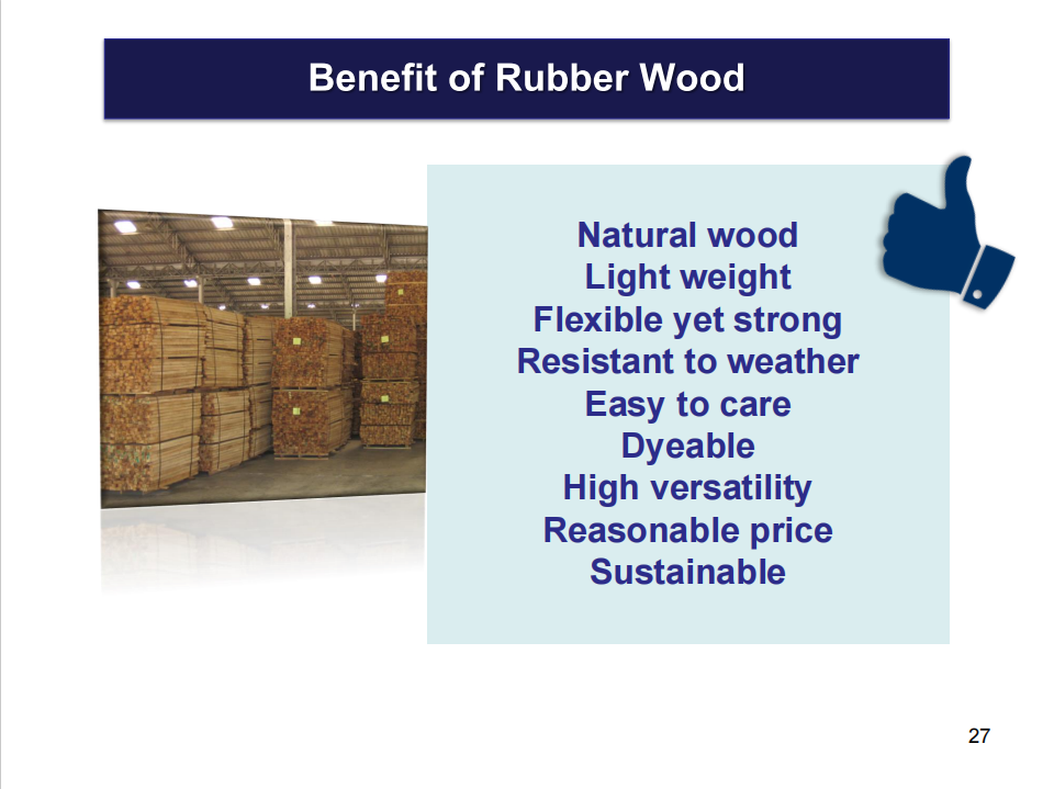 泰国不仅有性能出色的橡胶木原材料,还拥有款式新颖、造型美观的家具及各类木制品,并且泰王室政府保证,选用100%可持续和可管理的资源,原材料来自当地橡胶种植园,采用环保生产工艺。