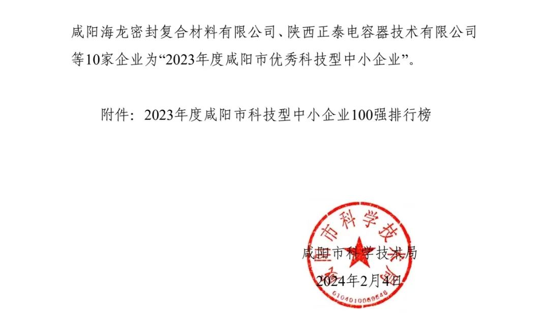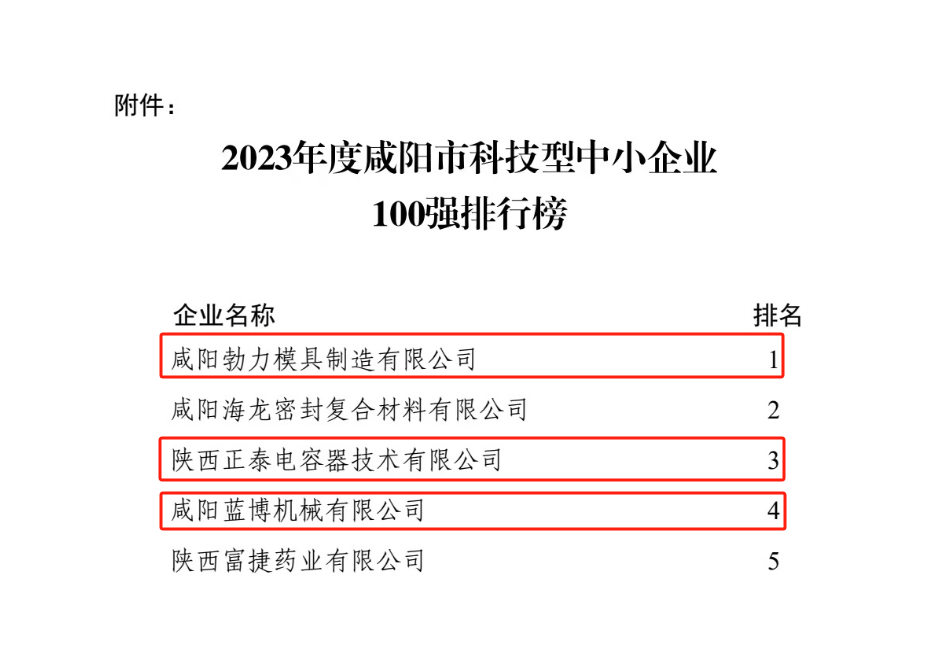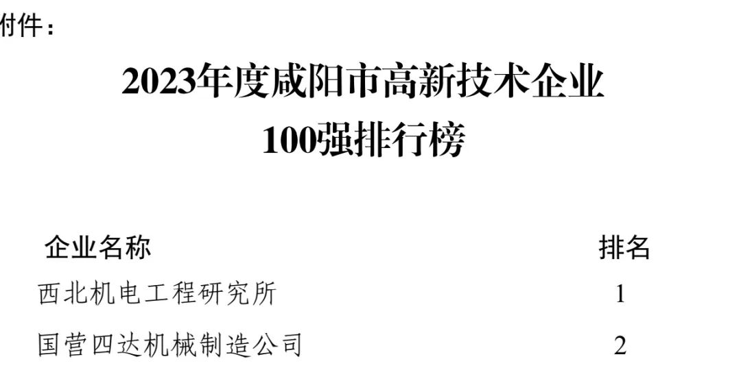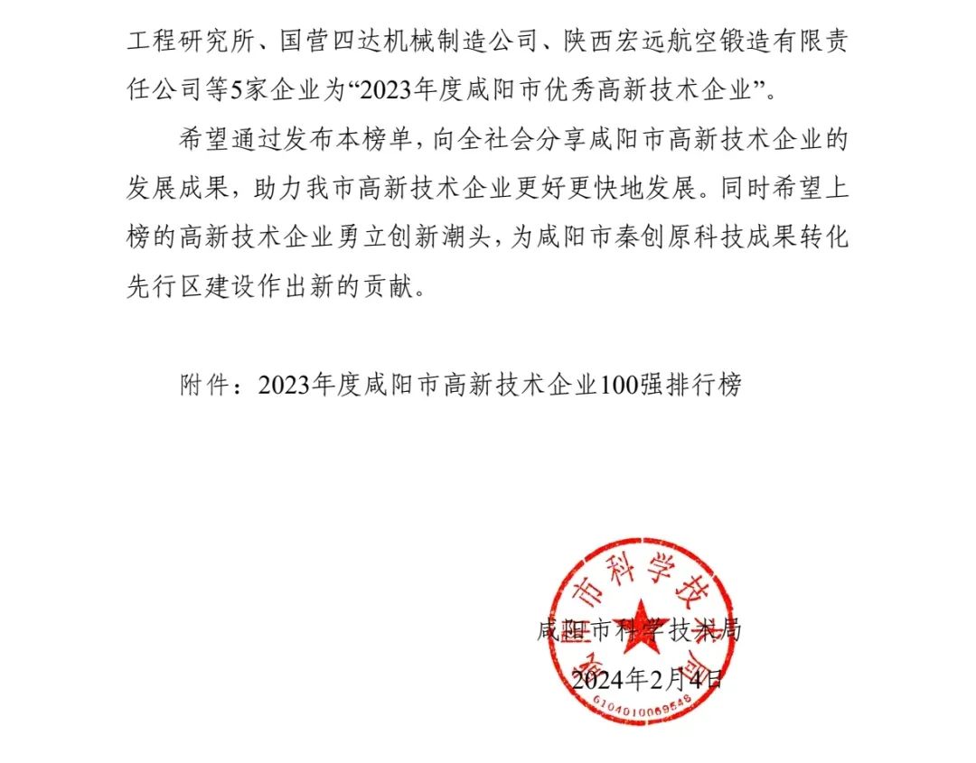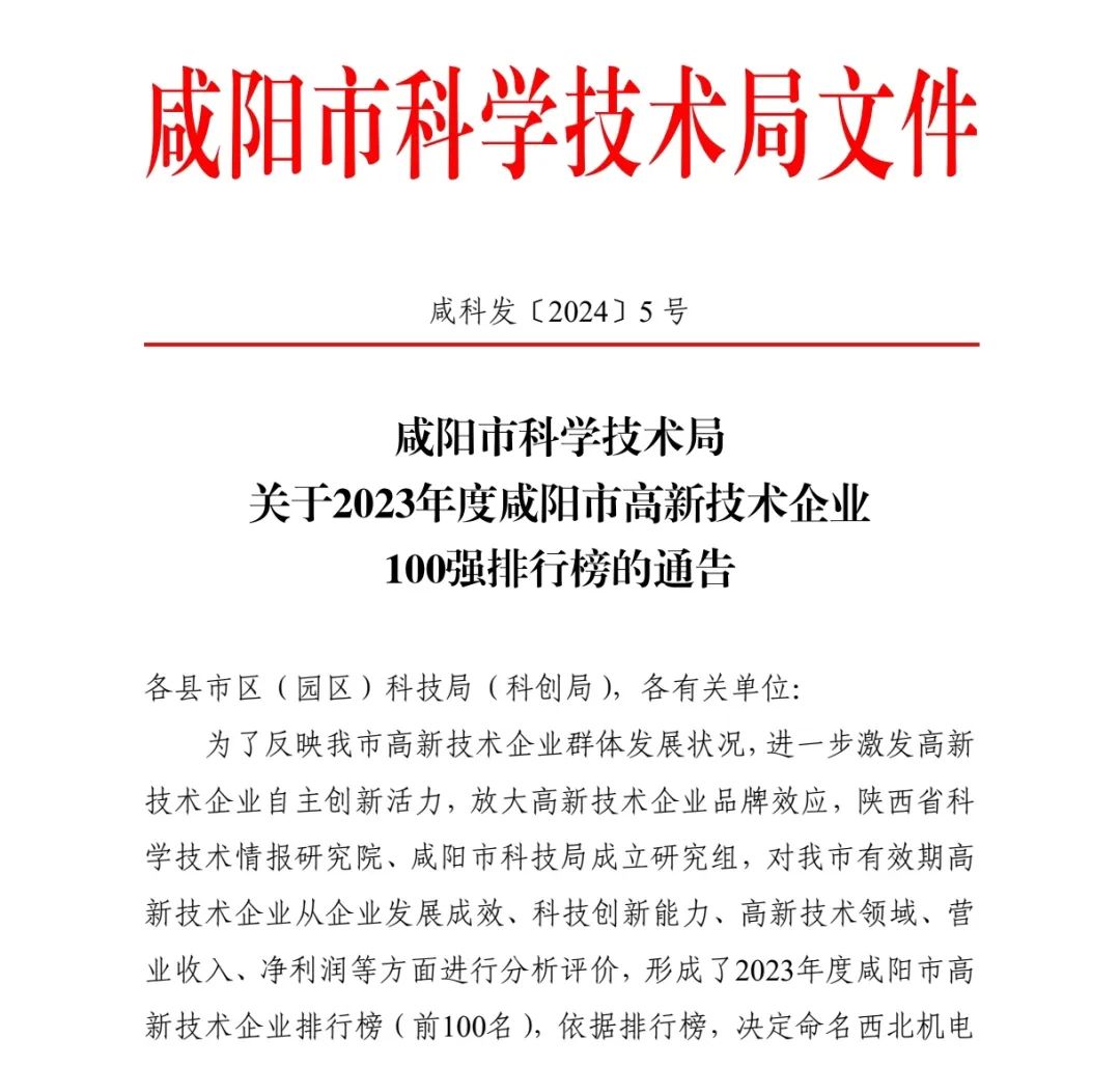 近日,咸阳市科学技术局发布通告,公布2023年度咸阳市科技型中小企业100强排行榜,2023年度高新技术企业100强排行榜。