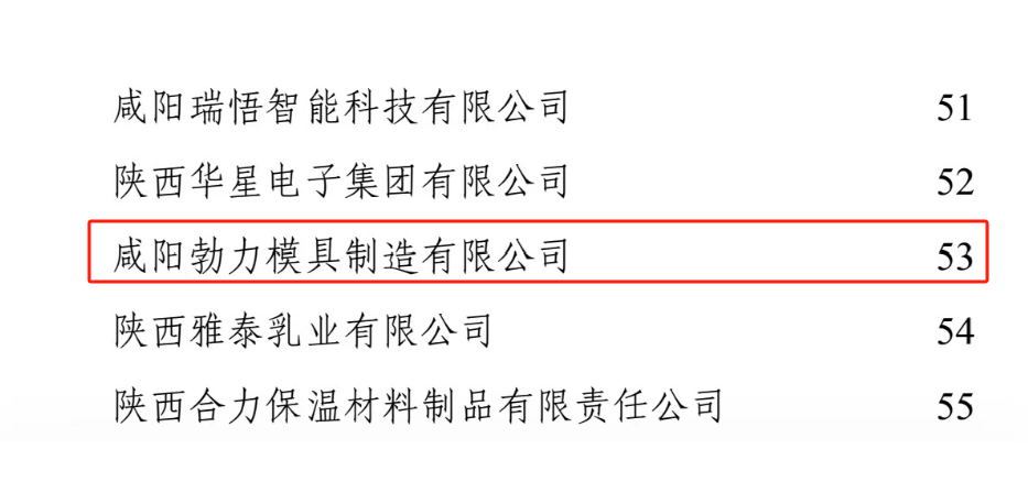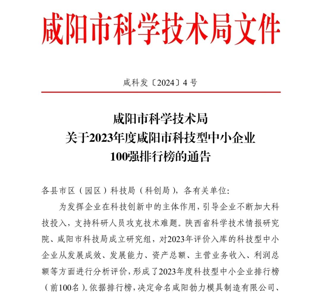 咸阳勃力模具制造有限公司等10户企业被命名为“2023年度咸阳市优秀科技型中小企业”。