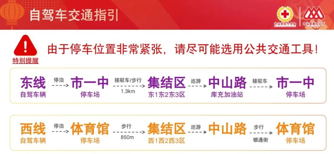 东线的队伍可在恒心酒楼对开或博爱路文化艺术中心旁辅道快速下客后,开往市一中车场或附近区域停放。慈善万人行巡游期间,公交集团特开专线,往返中山四路到文化艺术中心到市一中停车场,可以免费乘坐。