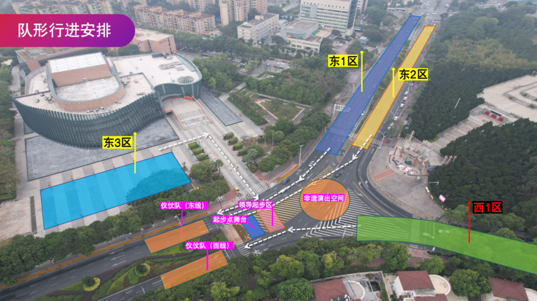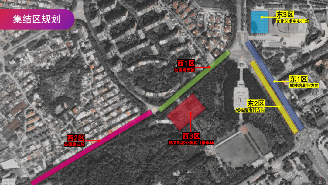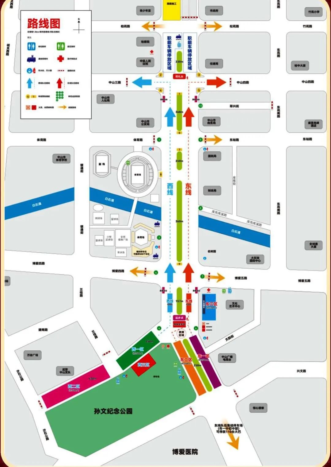 西线的队伍车辆建议停体育馆、体育场附近,然后自行步行至集结区。