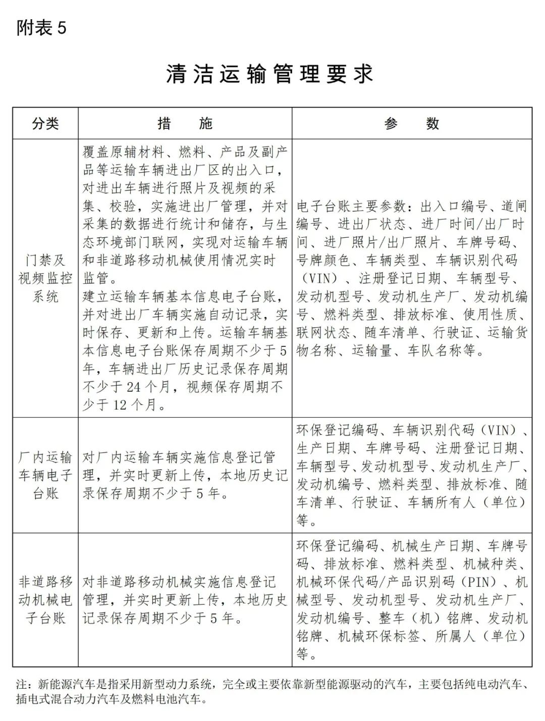 强化运输管理。配备专职人员加强运输管理,建设门禁及视频监控系统,以及进出厂运输车辆、厂内运输车辆、非道路移动机械电子台账。具体要求详见附表 5。
