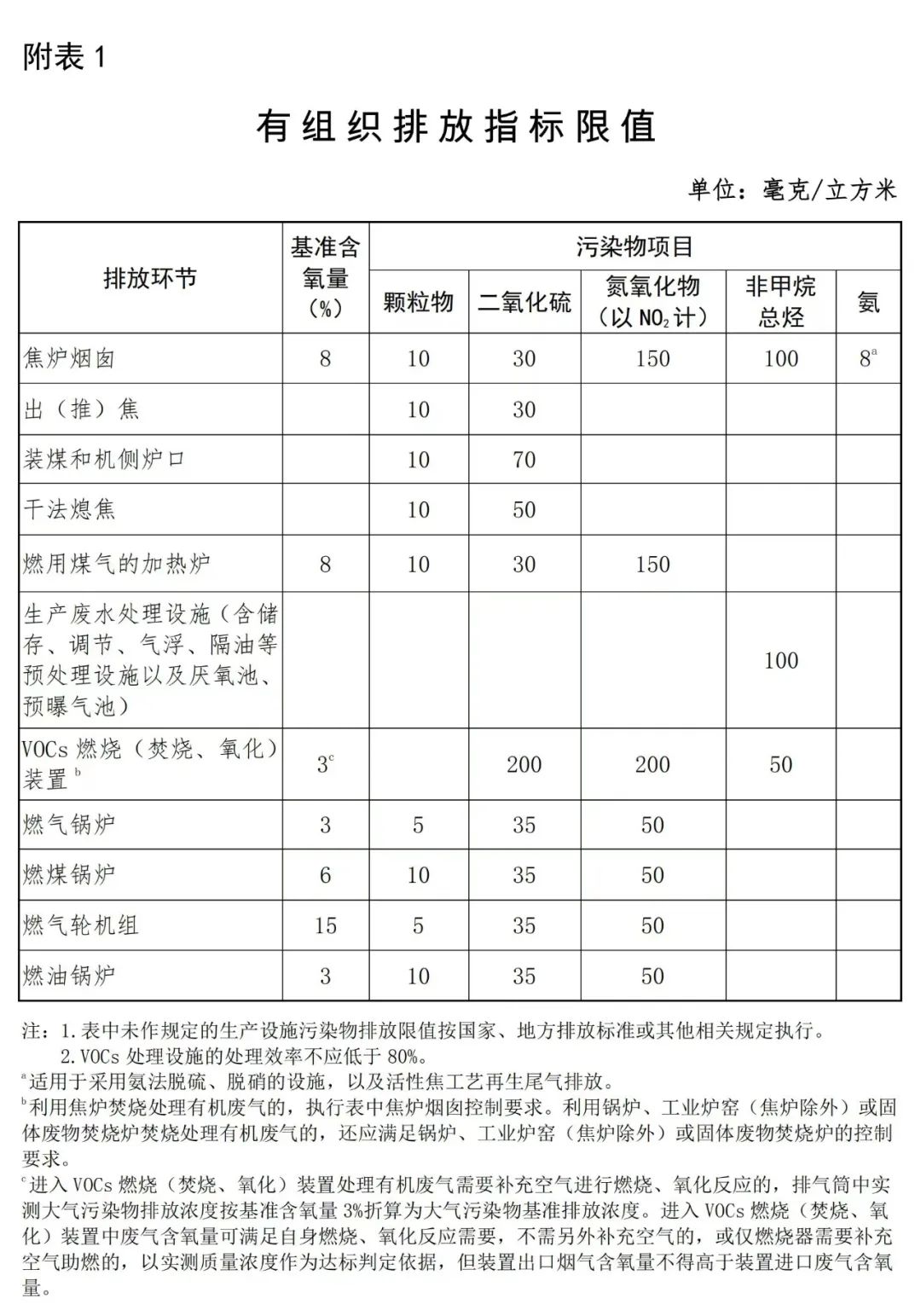 在基准含氧量 8%的条件下,焦炉烟囱废气颗粒物、二氧化硫、氮氧化物、非甲烷总烃、氨排放浓度小时均值分别不高于 10mg/m3、30mg/m3、150mg/m3、100mg/m3、8mg/m3;生产废水处理设施非甲烷总烃浓度小时均值不高于 100mg/m3。