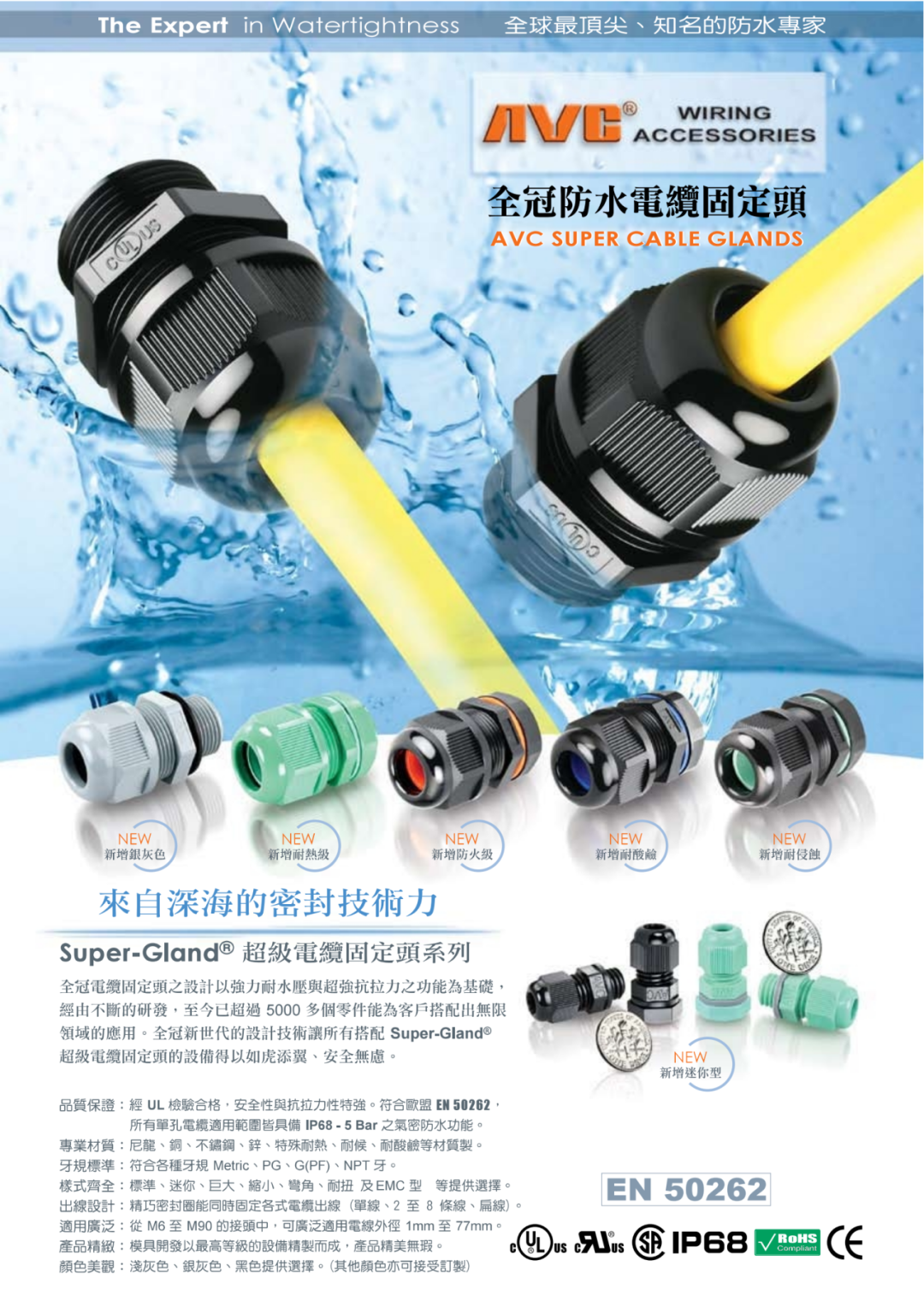 台湾全冠AVC创立于1973年,拥有四十馀年专业生产经验,产品质量可靠价格合理,符合多国电器标准认证,如UL、CSA、RU、VDE、CE及防尘防水IP68、IP69K等认证,并且符合欧洲环保联盟ROHS标准之SGS 认证。其产品广泛应用于电子、船舶、通讯工程、照明设备、交通设施、低压电器控制自动化、监视系统、电动升降设备、供电控制及各类型机械上。