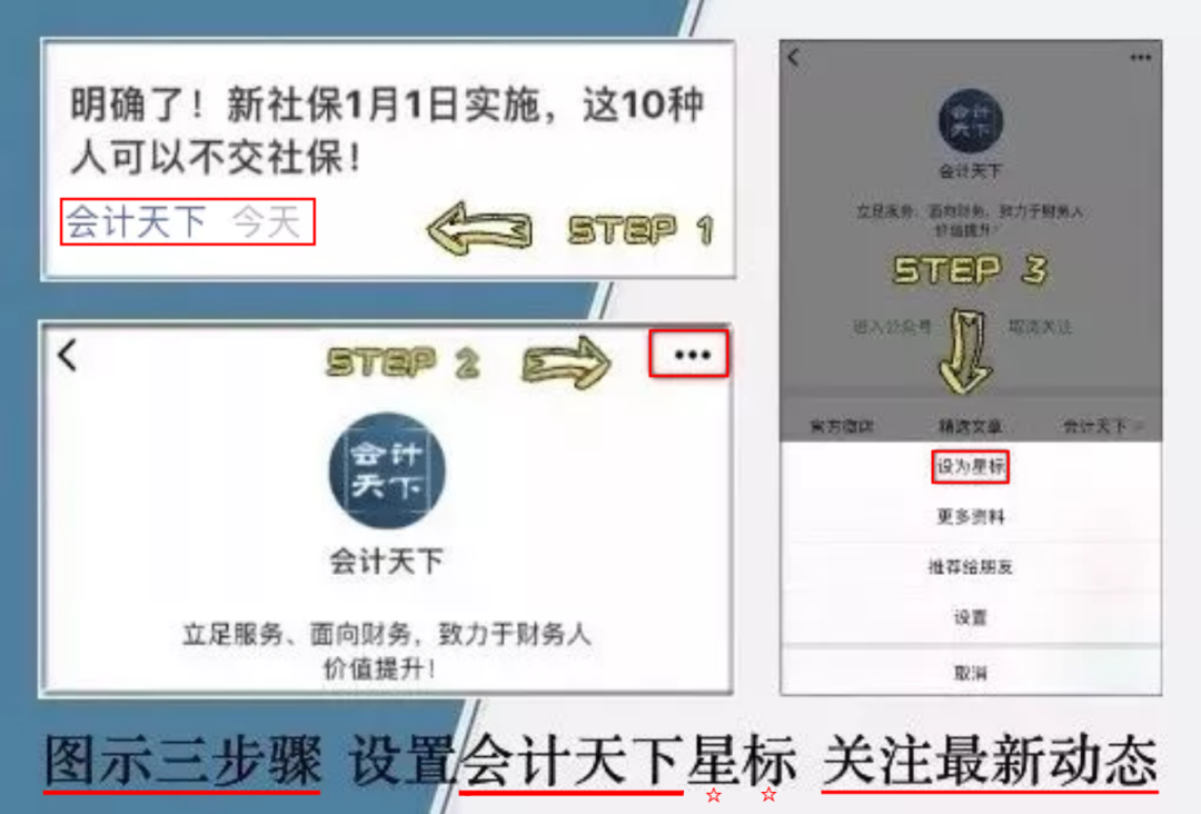 如果没有把【会计天下】设为 「 ★ 」 ,经常忘记「 留言 」「点赞 」「 在看 」,就看不到小天为大家精心准备的干货啦!所以,小伙伴们赶快进入公众号首页点击右上角“…“,“置顶”公众号或者设为「 ★ 」,多跟会计天下互动哦~