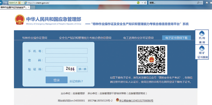 方法二:登录应急管理部政府网站(http://www.mem.gov.cn/),从“服务”中的“查询服务”进入“特种作业操作证及安全生产知识和管理能力考核合格信息查询平台”(以下简称“证书查询平台”),使用注册并实人认证的手机号登录系统,下载打印电子证书。