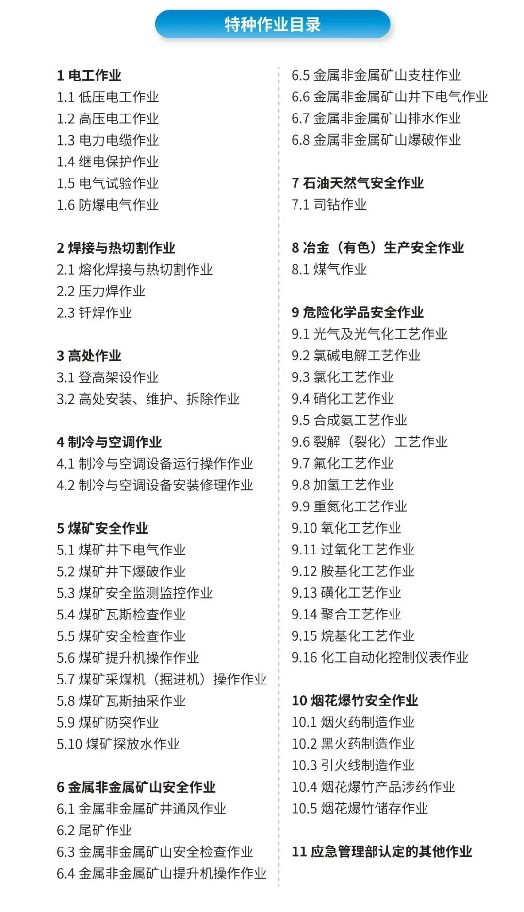 根据《特种作业人员安全技术培训考核管理规定》 的附件《特种作业目录》和《关于做好特种作业(电工)整 合工作有关事项的通知》(安监总人事〔2018〕18号),包括11个类别54个操作项目(工种)。具体如下: