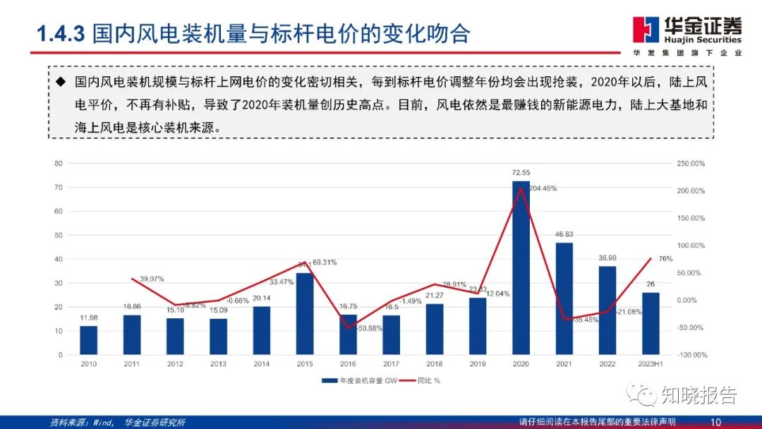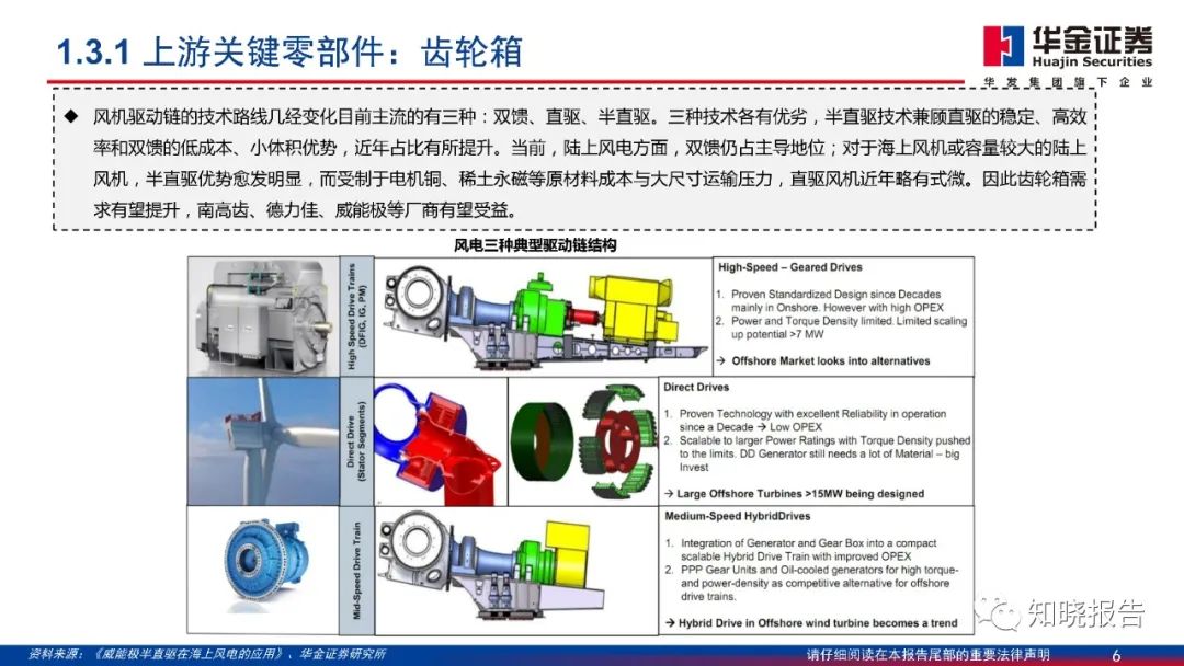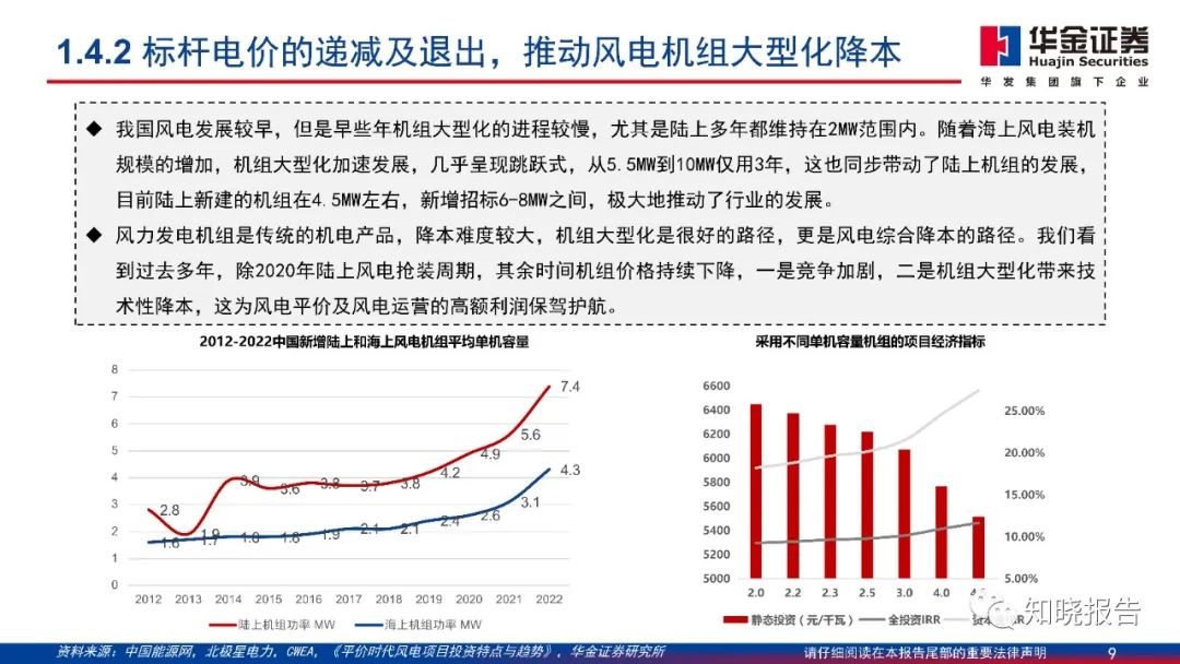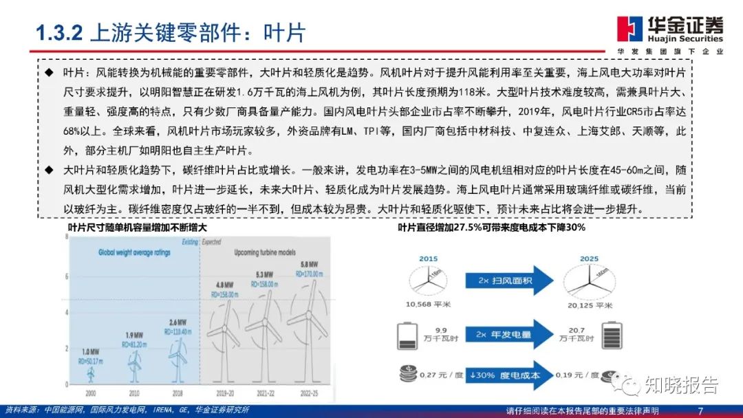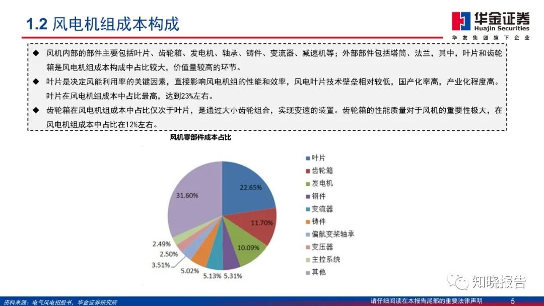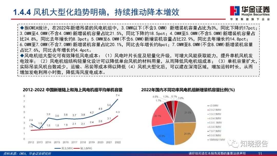 风力发电机组是传统的机电产品,降本难度较大,机组大型化是很好的路径,更是风电综合降本的路径。随着海上风电装机规模的增加,机组大型化发展加速,风机大型化趋势明确。同时,在行业降本压力和大型化趋势下,风机成本占比最高的叶片、齿轮箱同样面临降本需求和创新压力。