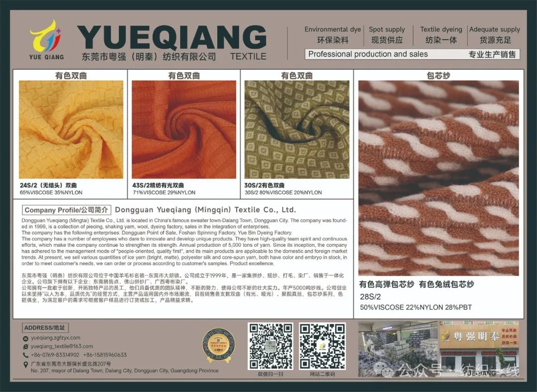 东莞市粤强(明泰)纺织有限公司位于中国羊毛衫名镇--东莞市大朗镇。公司成立于1999年,是一家集拼纱、摇纱、打毛、染厂、销售于一体化企业。公司旗下拥有以下企业:东莞销售点、佛山拼纱厂、广西粤彬染厂。