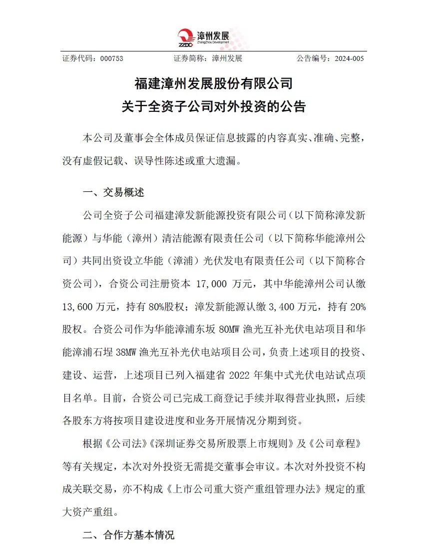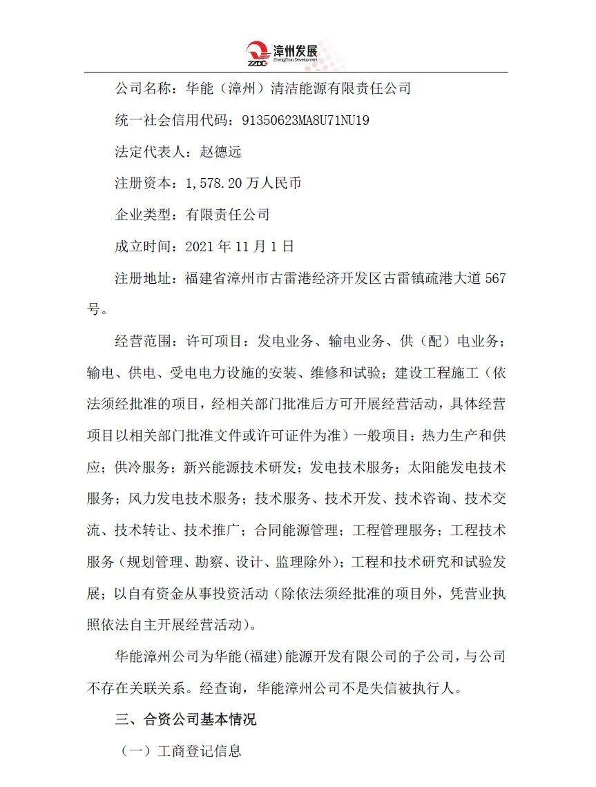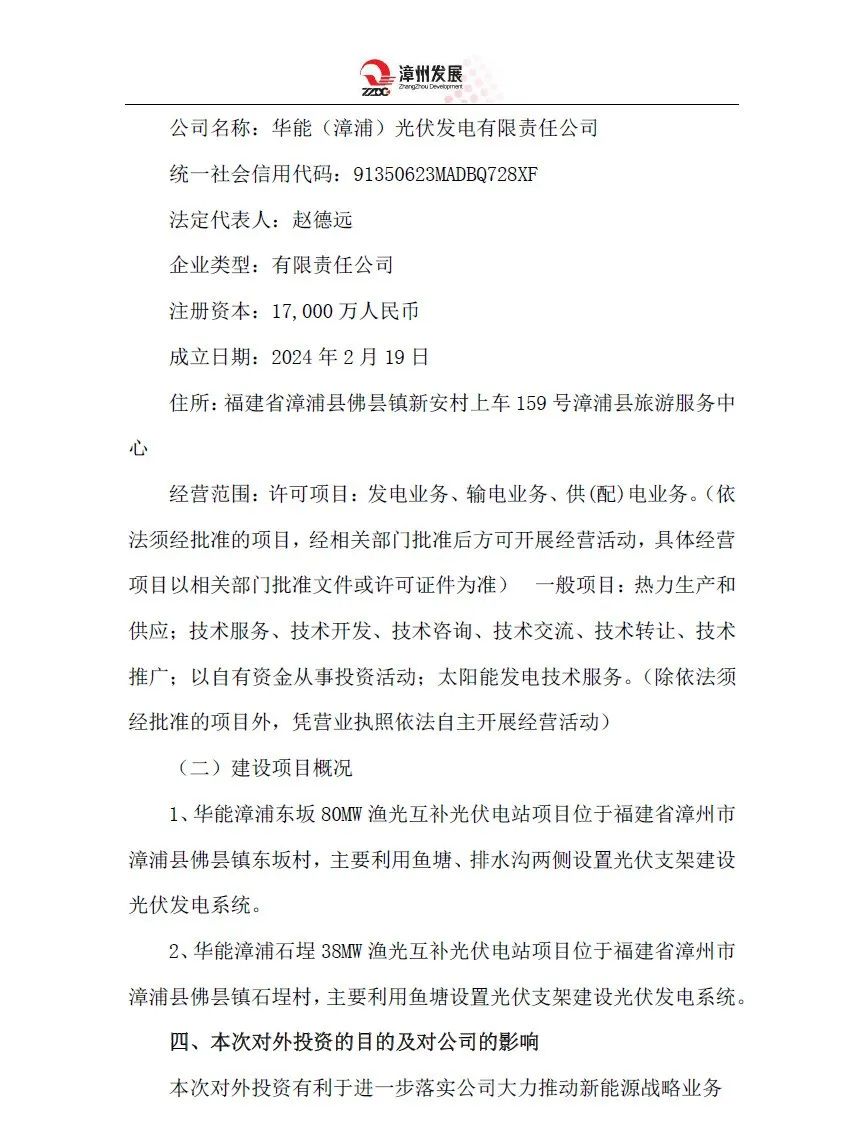 合资公司作为华能漳浦东坂80MW渔光互补光伏电站项目和华能漳浦石埕 38MW渔光互补光伏电站项目公司,负责上述项目的投资、建设、运营,上述项目已列入福建省2022年集中式光伏电站试点项目名单。目前,合资公司已完成工商登记手续并取得营业执照,后续各股东方将按项目建设进度和业务开展情况分期到资。