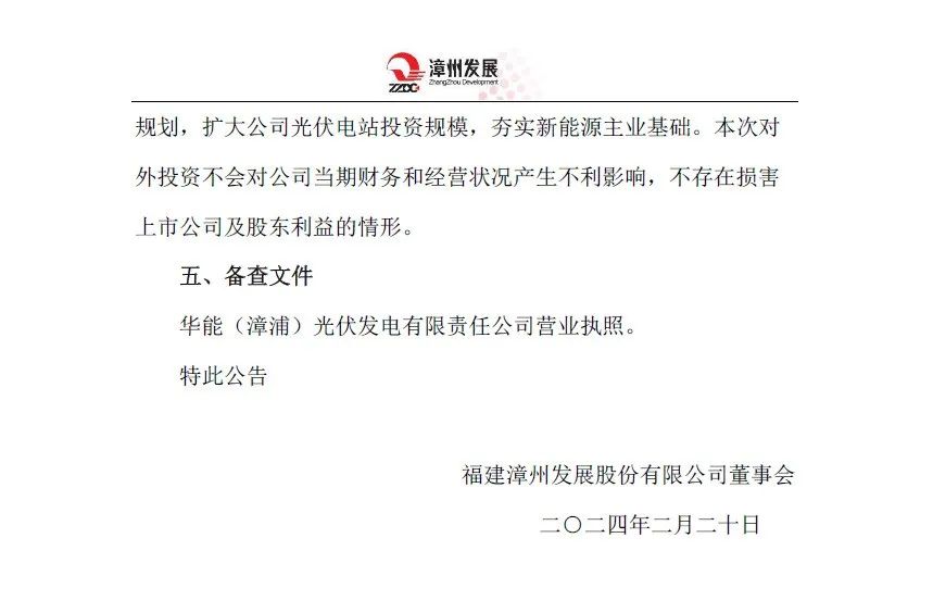 漳州发展表示,本次对外投资有利于进一步落实公司大力推动新能源战略业务规划,扩大公司光伏电站投资规模,夯实新能源主业基础。本次对 外投资不会对公司当期财务和经营状况产生不利影响,不存在损害上市公司及股东利益的情形。