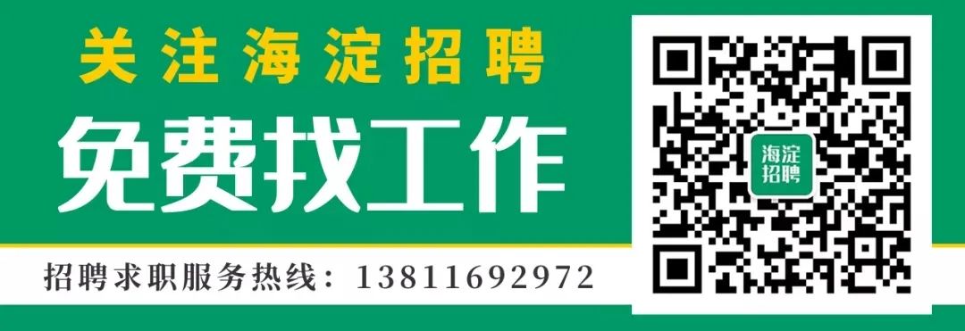 海淀招聘,一个分享海淀本地新职位的公众号。已经有好多小伙伴,通过海淀招聘找到了家门口的好工作,快点扫描下方二维码,免费订阅吧!