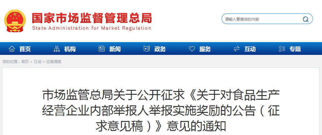 市场监管总局关于公开征求《关于对食品生产经营企业内部举报人举报实施奖励的公告(征求意见稿)》意见的通知