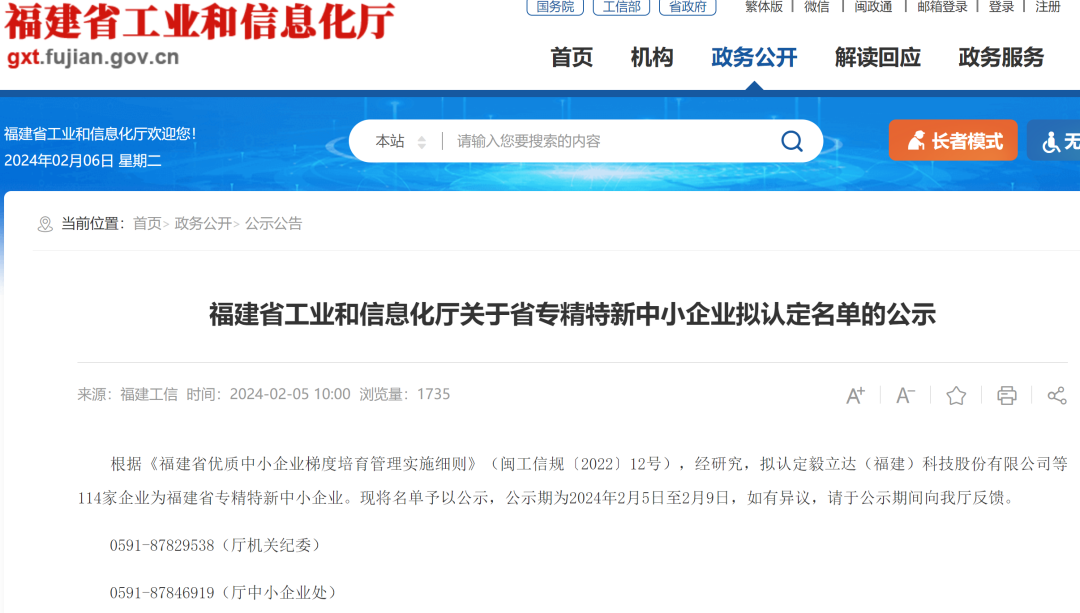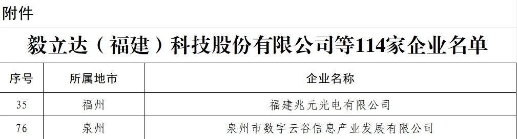 近日,根据《福建省优质中小企业梯度培育管理实施细则》(闽工信规〔2022〕12号),福建省工业和信息化厅公布了“福建省专精特新中小企业”拟认定名单,福建省电子信息集团成员企业福建兆元光电有限公司、泉州市数字云谷信息产业发展有限公司成功入选。