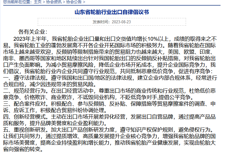近日,山东省橡胶行业协会发布了轮胎行业出口自律倡议书。