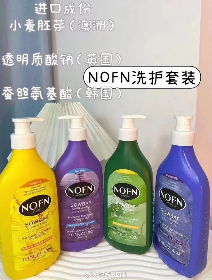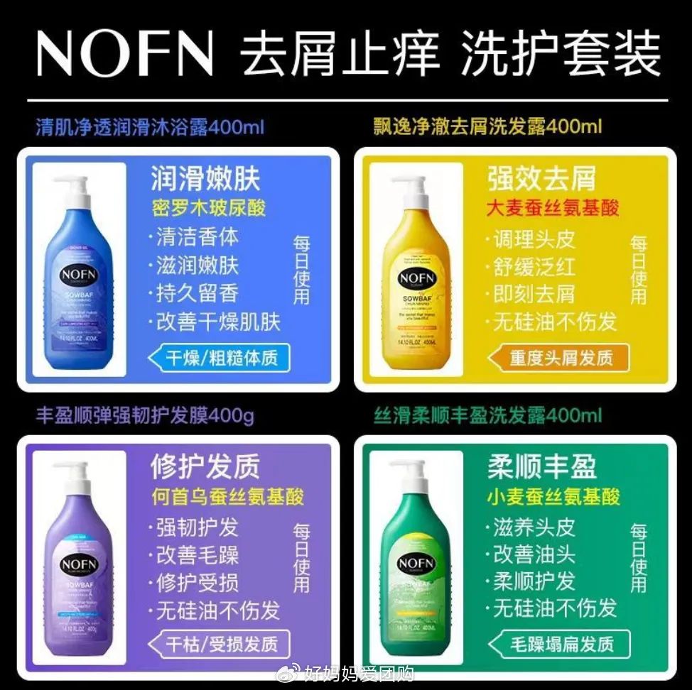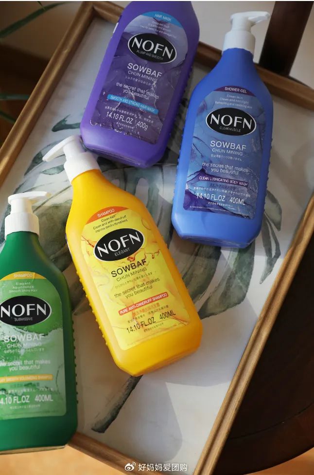 【款式】:NOFN 丝滑柔顺丰盈洗发露;NOFN 飘逸净澈去屑洗发露;NOFN 丰盈顺弹强韧护发膜;NOFN 清肌净透润滑沐浴露;NOFN奢润清肌净透香水沐浴露