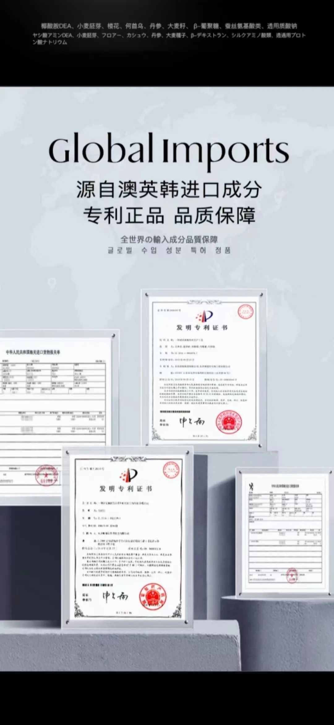 使用进口成份,英国透明质酸钠,韩国蚕丝氨基酸类,澳大利亚小麦大麦胚芽提取物。