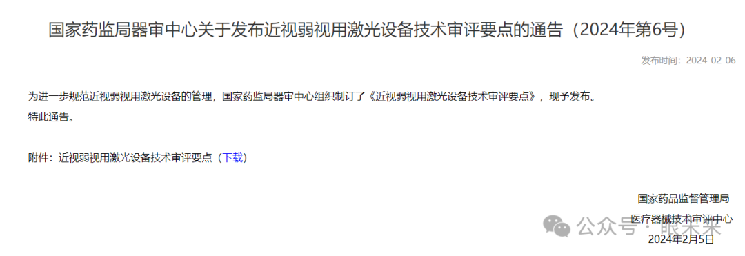 近期,为进一步规范近视弱视用激光设备的管理,国家药监局器审中心制订并发布了关于近视弱视用激光设备技术审评要点的通告(2024年第6号)。眼未来为广大业内人士整理了部分主要内容,如需获取全文,请见文末附件链接。