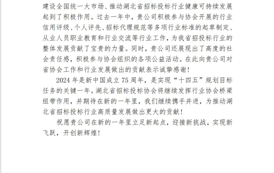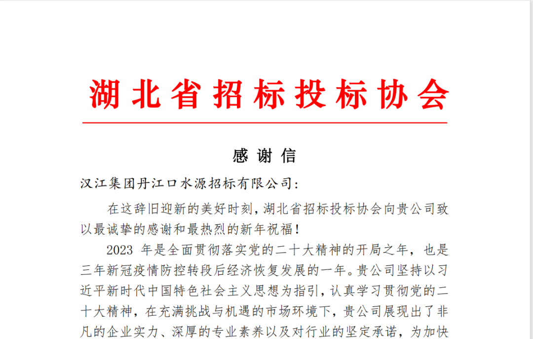 省招协在信中表示,2023年,水源招标公司为加快建设全国统一大市场、推动湖北省招标投标行业健康可持续发展起到了积极作用,期待在新的一年里,双方继续携手并进,为推动湖北省招投标行业高质量发展作出更大贡献。