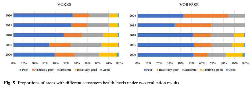 结果:2000—2020年,中国生态系统健康值总体空间格局以南部和东南沿海地区较高,低健康值主要分布在西部地区、内蒙古部分地区和大都市地区,呈东南向西北递减趋势。生态系统的潜在供应量与实际供应量之间的不平衡极大地加剧了区域生态系统健康的恶化。研究期间,中国区域生态系统的健康状况比传统的活力-组织-韧性-生态系统服务(VORES)评价更为不健康。