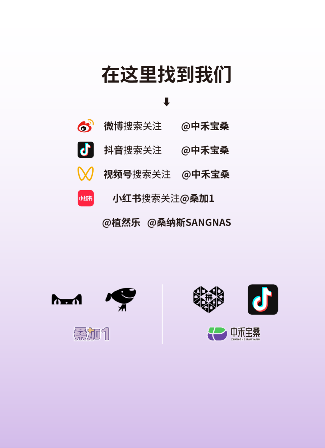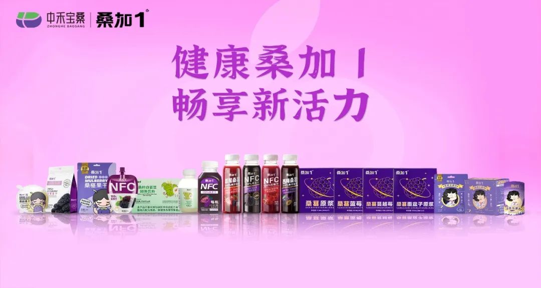桑加1,是中禾宝桑旗下围绕桑元素,以果汁品类为核心,覆盖全价盘的综合性品牌。基于药食同源的理念,聚焦桑葚细分品类,其中包含:NFC100%桑葚汁、NFC100%桑葚果干、桑叶白芸豆等,探索桑葚的营养价值,以优质、健康、美味的产品,让更多人体验到桑葚的魅力。