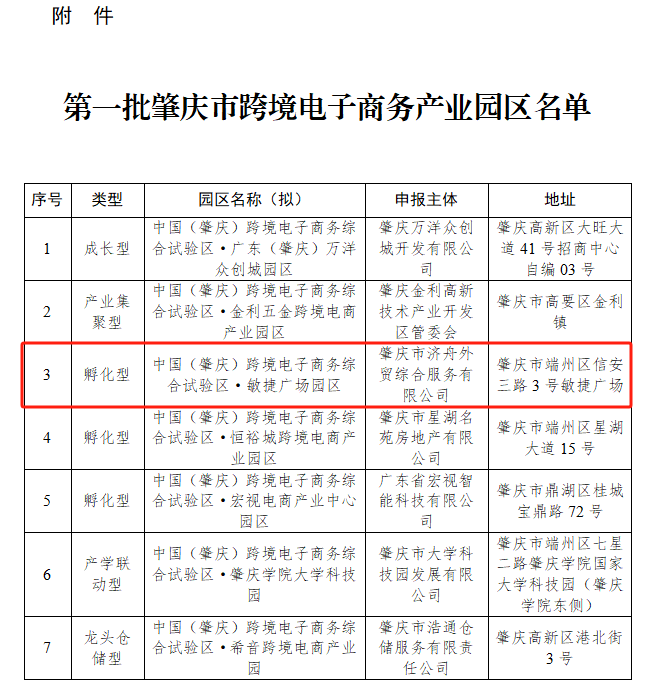 热烈祝贺我司牵头申报的中国(肇庆)跨境电子商务综合试验区·敏捷广场园区(孵化型)审核通过成为第一批肇庆市跨境电子商务产业园区