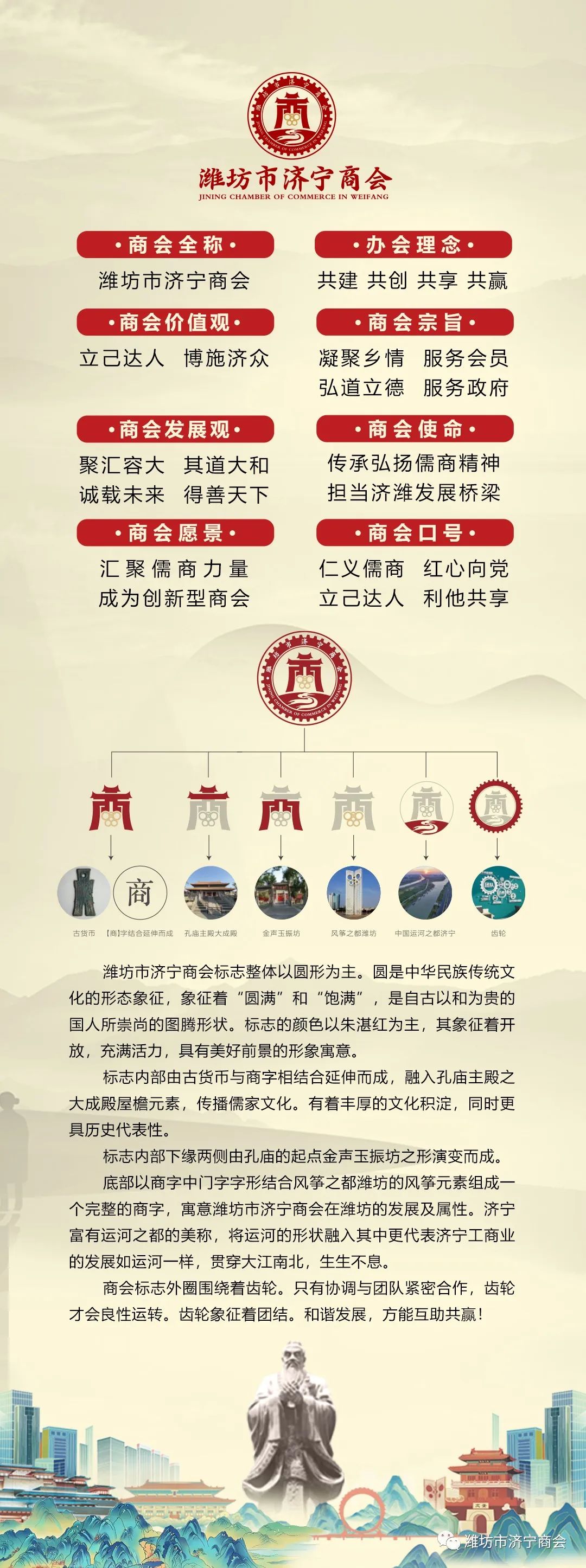 心怀苍生,道济天下,潍坊市济宁商会始终秉承仁者爱人、见利思义、以义取利、以人为本、以德为重、以和为贵、诚实守信、内圣外王、宽厚圆融、立己达人的儒家精神内核,持续践行身在商界,义利并举,以德立身,诚信爱国的价值理念,以倾情建设更好潍坊为己任,以倾心回报家乡为情怀,与时消息、与时偕行、与时俱进,携手共建充满人文精神的新儒商典范。