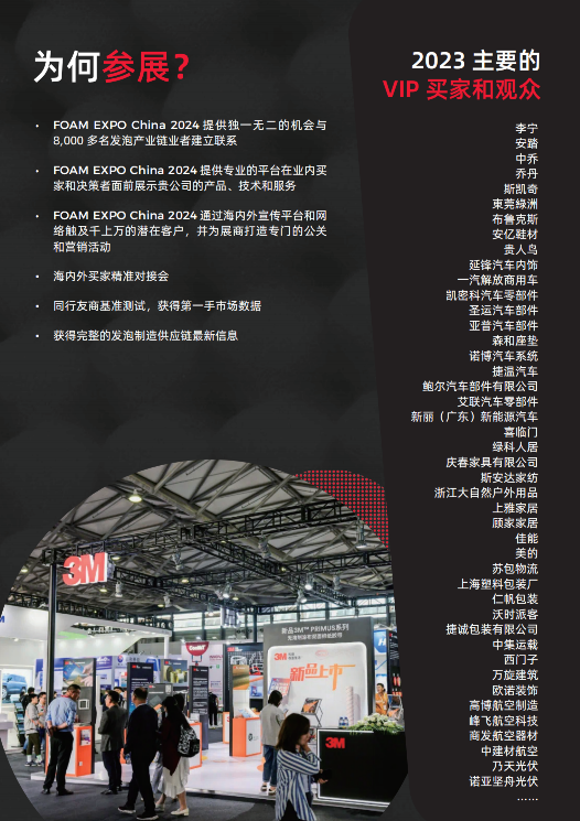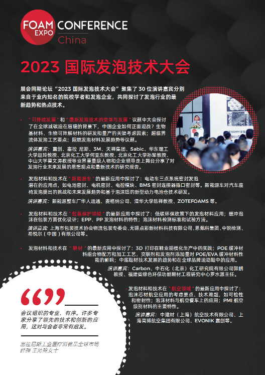 FOAM EXPO China 国际发泡技术(上海)展览会聚焦发泡原料、发泡材料、发泡助剂、发泡工艺、发泡制品及半成品、发泡设备、切割设备和回收设备,秉承“链”通国际理念,以“发泡技术”为节点,汇聚全球众多知名企业,链接发泡技术产业链与各类终端应用行业领域的合作与对接,为产业提效与升级承担使命和责任。