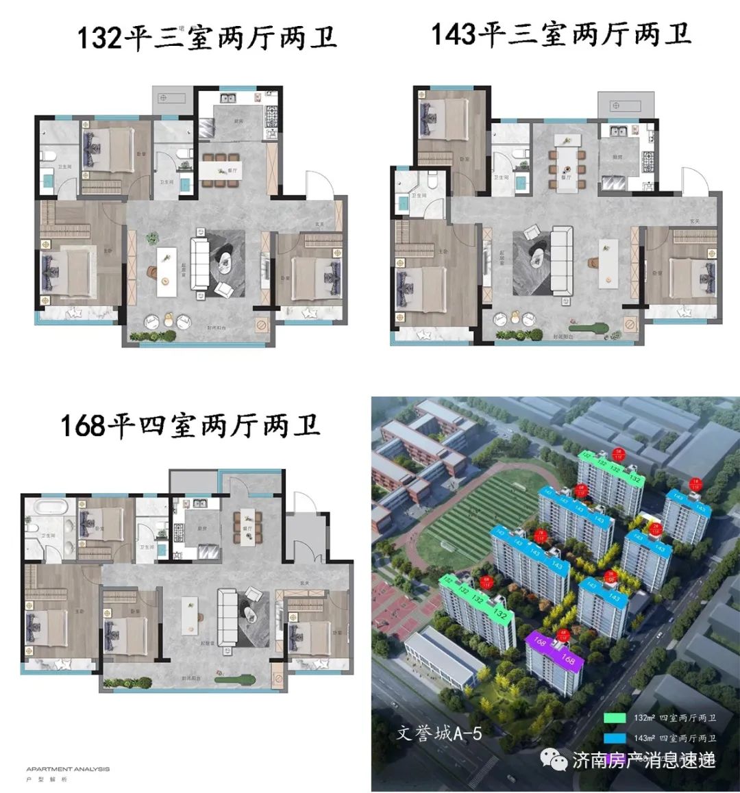A-5地块户型分为132-143-168平,其中132平88套,143平152套,168平18套