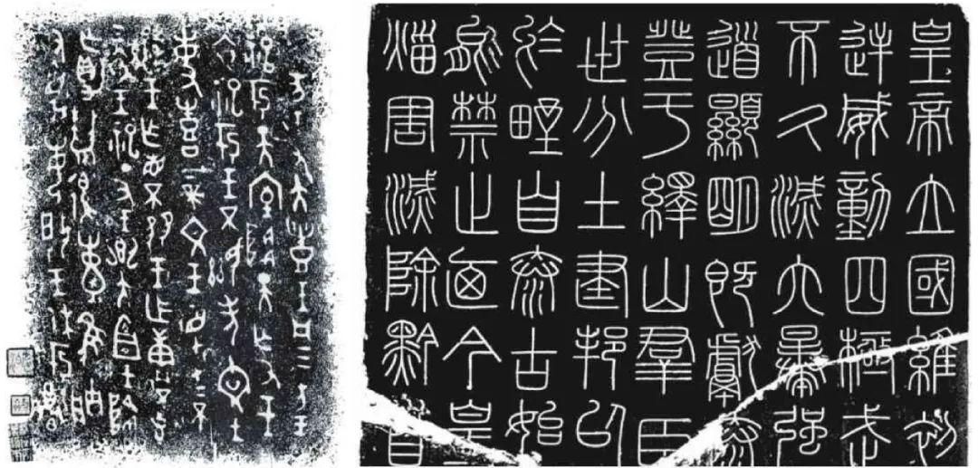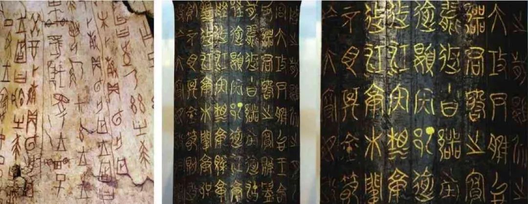 左:《祭祀狩猎涂朱牛骨刻辞》正面局部。右:鄂君启铜节,战国时期青铜器物。